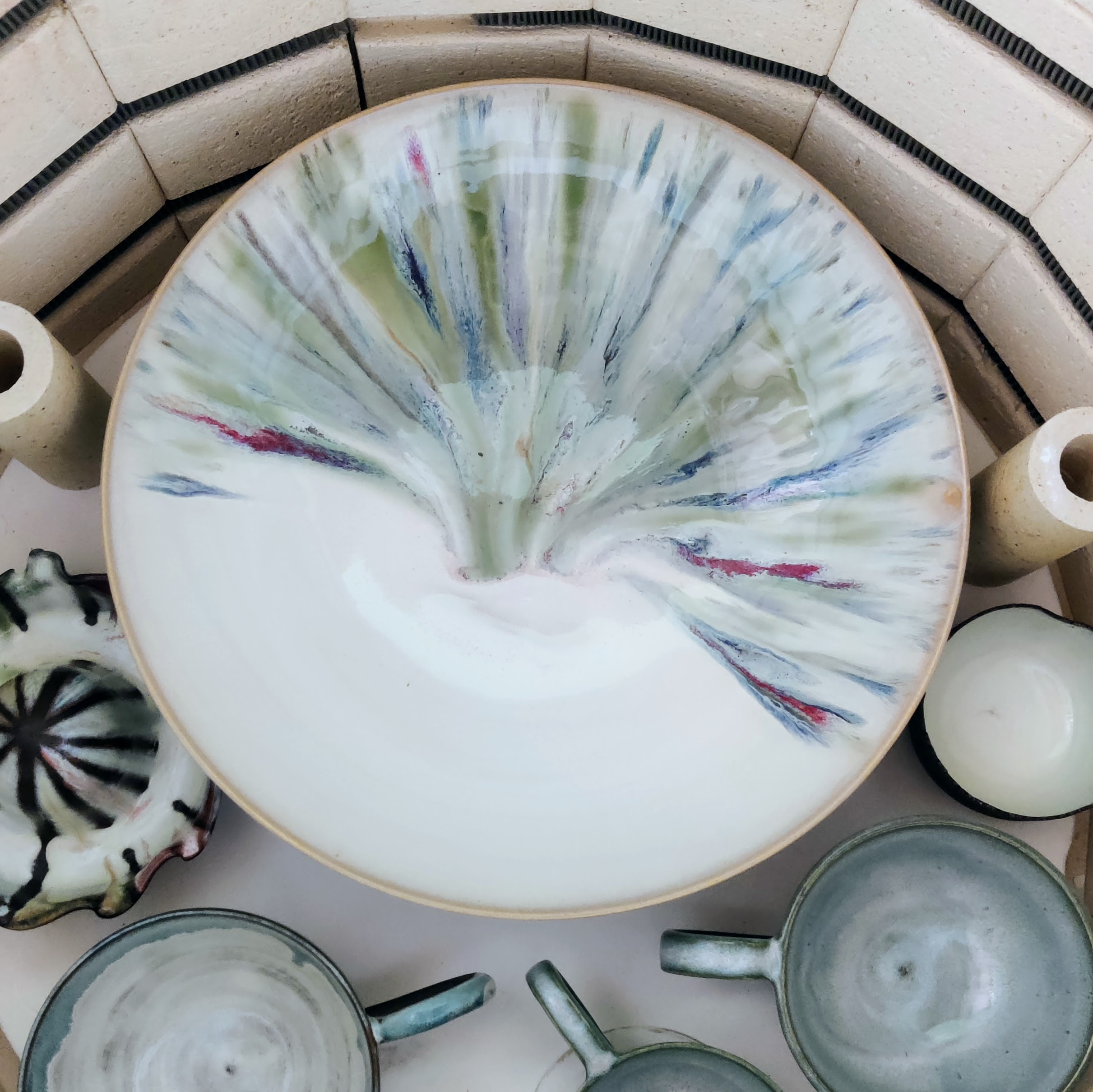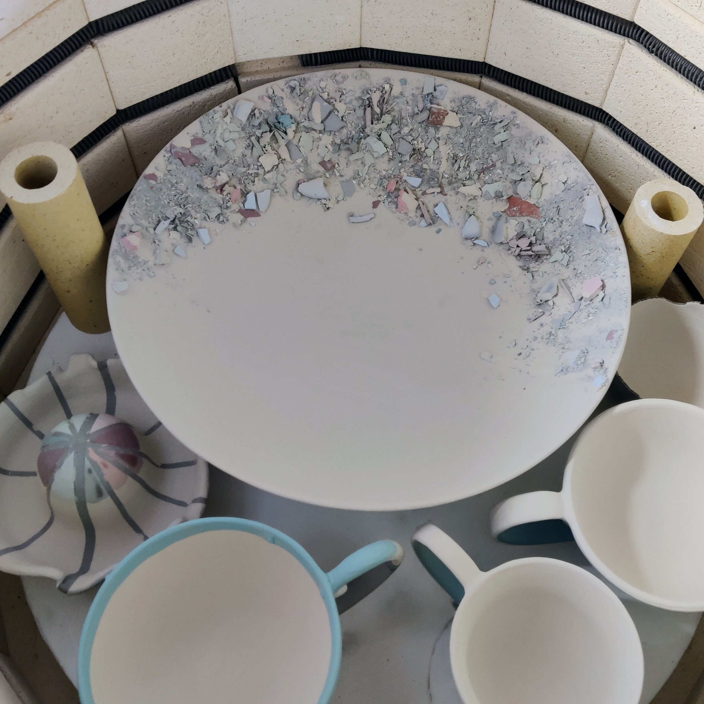 Jeg genbruger glasurrester - fx ved at udtøre glasuren og flække den i flager eller ‘chips’, som jeg fordeler på en lys basisglasur, fx Peral White fra Spectrum eller Snow Celadon eller Honney Flux fra Amaco. Nogle gange er resultatet brunt og kedeligt (og det er jo surt!), men meget oftere giver det en uforudsigelig ener af en farveeksplosion - og så er genbrug jo virkelig sjovt!
